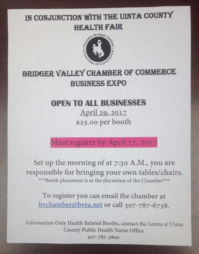 Greater Bridger Valley Chamber Community Luncheon May 10th, 2017 12:00 -1:00 P.M. Lyman Fire Hall, 114 E Sage, Lyman, WY Upstairs Meeting Room $10.00 per plate ~~~~~~~~~~~~~~~~~~~~~~~~~~ May’s Featured Speaker: Thayne Peterson “Legislative Review” ~~~~~~~~~~~~~~~~~~~~~~~~~~ Please R.S.V.P by 5/5/17 as seating is limited For further information contact: [email protected] or 307-787-6738 Robert Condie with Wyoming […]